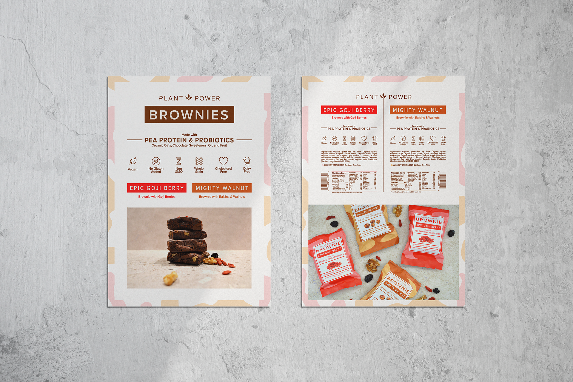 Plant Power is a plant-based fast food chain. I created the sell sheet design for their new brownies, including its product photography.